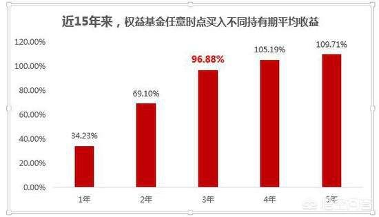 之前,证监会做过一个统计,计算了十五年来,任意时间点买入权益性基金的平均收益率。数据显示买入后: