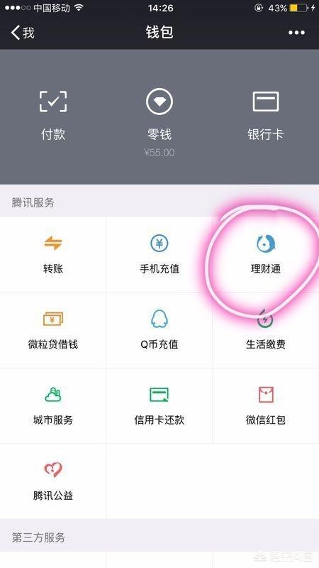 第一步:登录微信,进入钱包页面,点击“理财通”