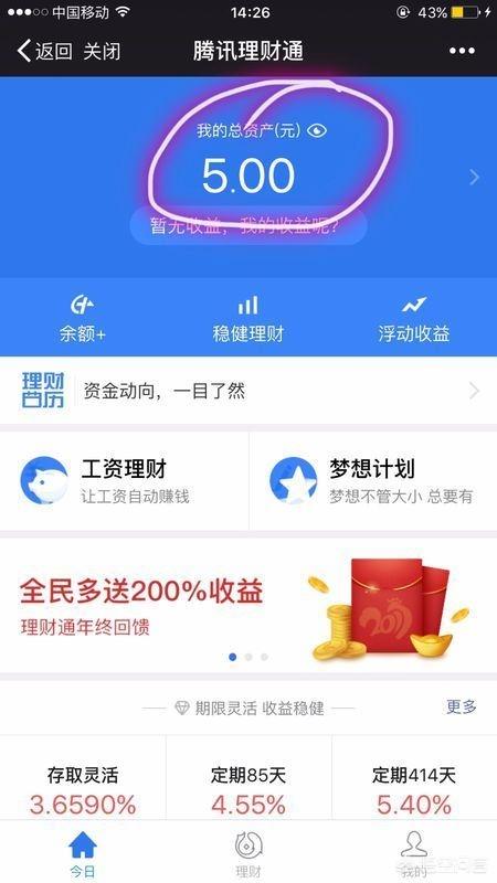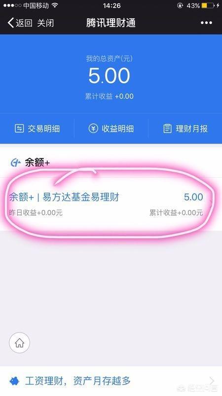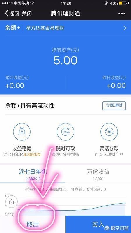 微信理财通的钱要转回到银行卡,只要在买入的理财项目底部点击取出就可以了。下面以苹果6sp微信6.5.3版为例,具体步骤如下:
