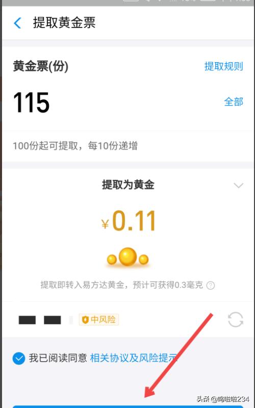 5、选择你需要提取的黄金票份数,同意协议并点击“确认提取”即可。